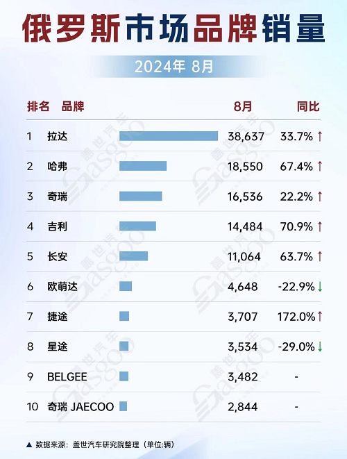 车能前沿研究院:从2024年8月俄罗斯市场品牌销量数据来看,中国品牌汽车在俄罗斯市场的表现突出,销量增长势头强劲。哈弗品牌销量同比大增67.4%,达到18550辆。奇瑞、吉利和长安也紧随其后,销量分别同比增加22.2%、70.9%和63.7%,具体销量分别为16536辆、14484辆和11064辆。捷途同比大幅增加172%到3707辆,成为销量增长最快的中国品牌之一。