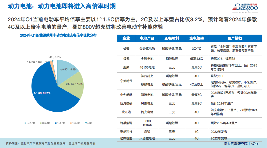 不过,正如上述分析师所说,目前这类产品还是概念化居多。据其分享的数据,今年第一季度,电动车平均倍率主要以1~1.5C倍率为主,2C及以上车型占比仅3.2%,预计随着2024年多款4C及以上倍率电池的量产,叠加800V超充桩,将改善电动车补能体验。
