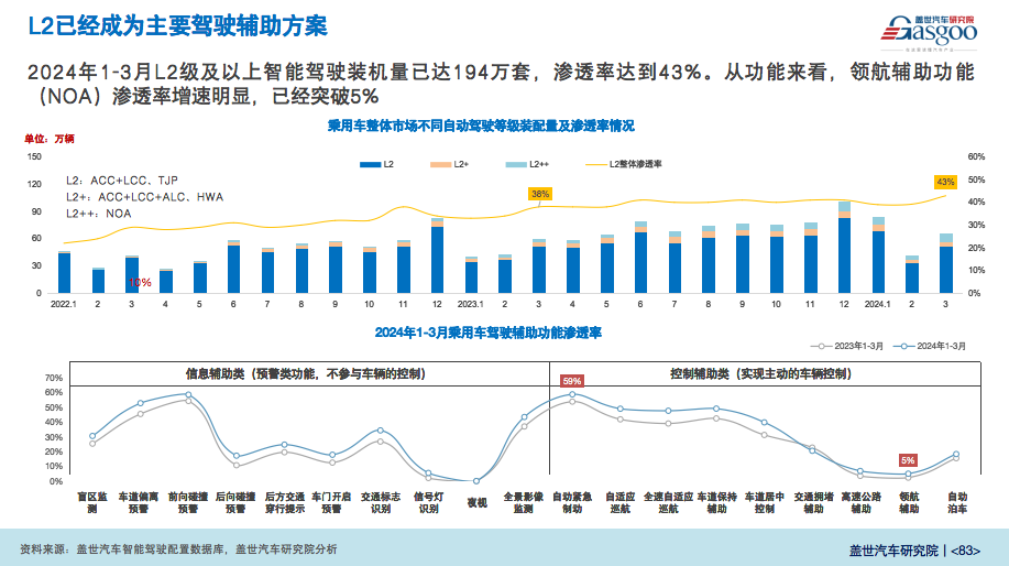 整体市场来看,L2已成为主要驾驶辅助方案。车能前沿研究院相关统计数据显示,今年第一季度,L2级及以上智能驾驶装机量已达194万套,渗透率达到43%。