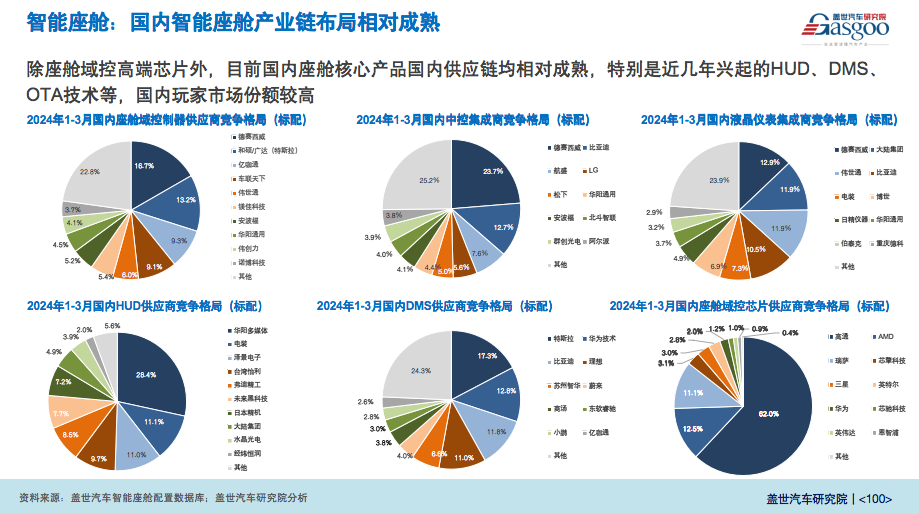 从供应链来看,除座舱域控高端芯片外,目前国内座舱核心产品国内供应链均相对成熟,特别是近几年兴起的HUD、DMS、OTA技术等,国内玩家市场份额较高。