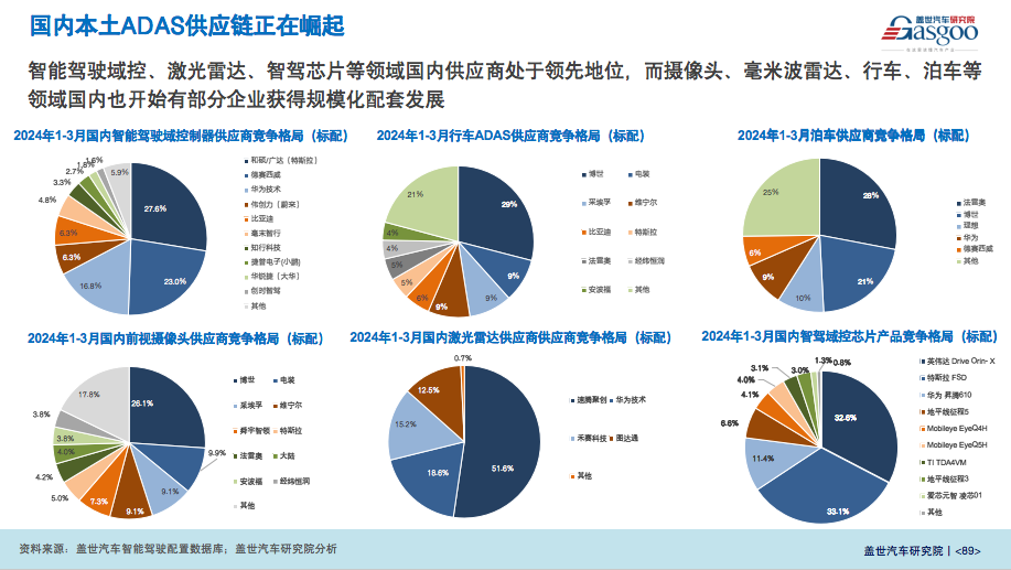 具体来看,智能驾驶域控、激光雷达、智驾芯片等领域国内供应商处于领先地位,而摄像头、毫米波雷达、行车、泊车等领域国内也开始有部分企业获得规模化配套发展。