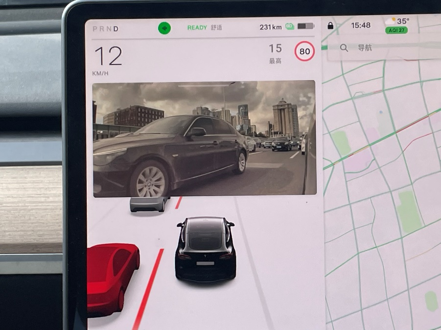2. 观察电子后视镜,后方车辆显得明显还很远,但实际回头看时,车辆已经接近车身侧面,距离感不准确。