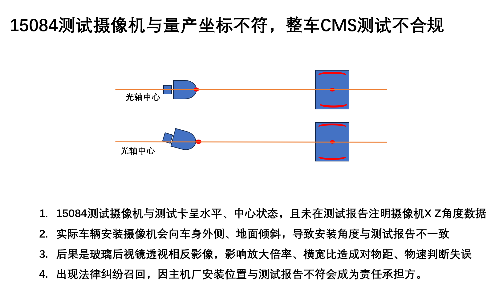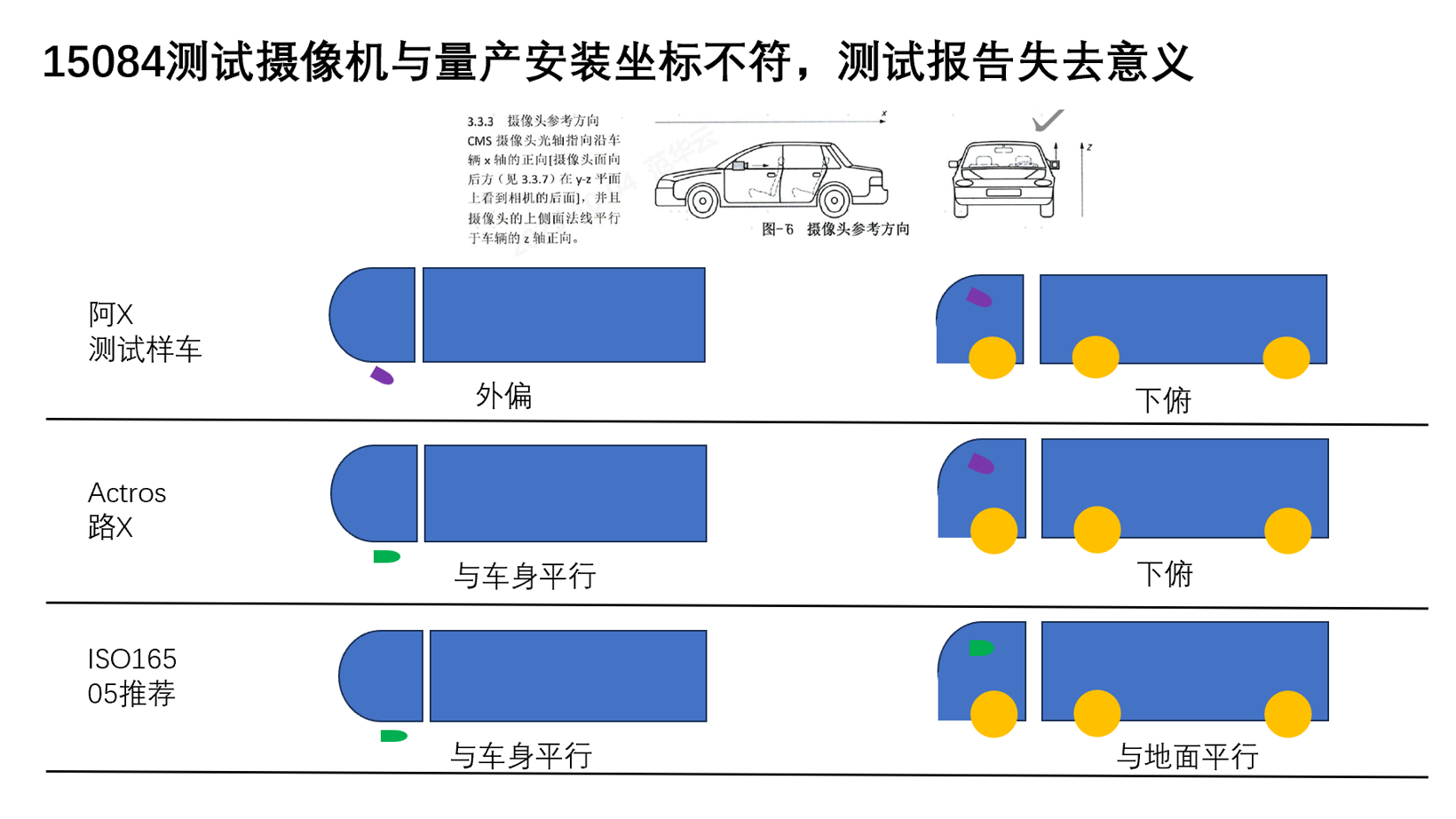 问题出在摄像机测试时与测试板坐标与实车安装坐标不符,CMS单一部件符合标准测试,整车不合规。