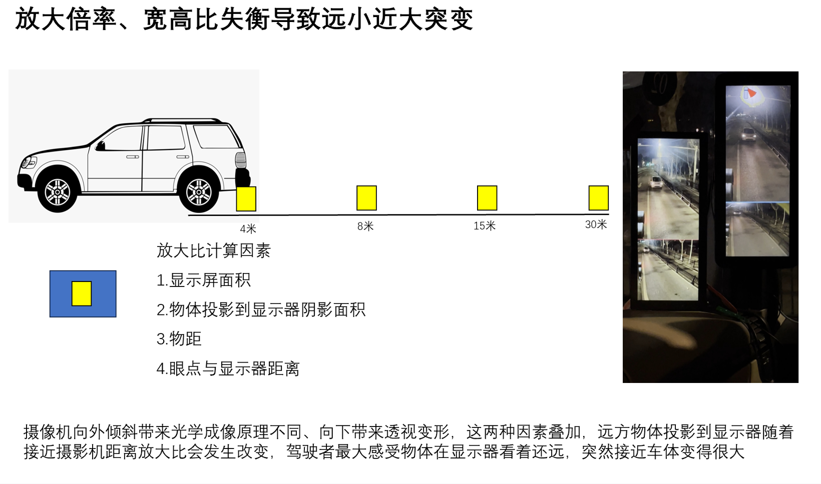 解读GB-15084法规仅是CMS产品研发的入门,将法规要求转化为数据模型通过数学计算结合光学知识、电子软硬件配合,使得显示画面可移动、变化还不影响观察物的放大倍率、高宽比两大法规测试指标。驾驶者依据被观察物体在显示器成像大小及大小变化的时间,判断本车与观察物体的距离和速度。物距、物速对驾驶车辆的安全重要性至关重要,拓展视野的技术实施方法成为专利并非妄为。