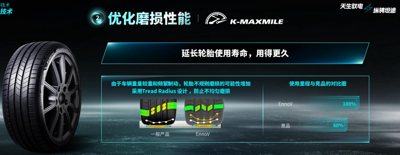 其次,由于车辆重量较重和紧急制动,轮胎不规则磨损的可能性增加。针对此,EnnoV产品采用了Tread Radius设计,防止不均匀磨损。与此同时,还采用了高分散精密二氧化硅的EV专用复合材料,大幅改善了磨损性能和制动力,进而延长轮胎使用寿命。