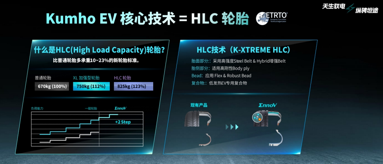 据介绍,HLC(High Load Capacity)技术满足了新能源汽车既能承受更高的负荷,还能体现最佳性能的结构设计方法,而HLC轮胎则比普通轮胎多承重10-23%。“EnnoV”系列轮胎以革新的HLC技术为基础,轮胎内的高刚性钢丝带束层可防止胎面变形,而高强度聚酯帘线的搭载,也能确保车辆在转弯时固定胎体结构,保持车辆稳定。诸多技术加持下,完全可以应对新能源汽车高负荷需求。