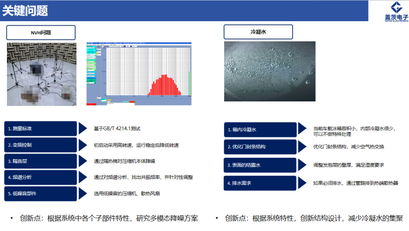 针对NVH问题,盖茨通过变频控制、隔音材料应用和选用低噪风扇等方式,有效降低了噪音。通过优化密封设计,减少空气热交换,避免冷凝水的聚集。合理设计保温层壁厚,避免温度低于凝露温度,从而确保车载冰箱的稳定运行。