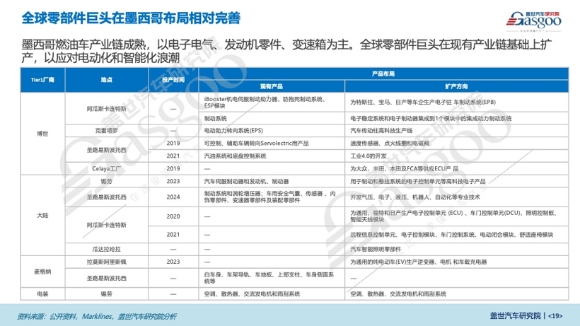 全球零部件巨头在墨西哥布局完善,本土零部件企业集中在墨巴两国,在零部件产值中,电子电气、发动机零件、变速箱和离合器、地毯和座椅的占比较高。同时博世、大陆等全球零部件巨头在现有产业链基础上扩产,以应对电动化和智能化浪潮。
