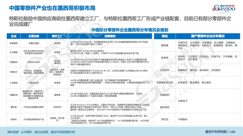 特斯拉正在筹备墨西哥超级工厂,鼓励中国供应商前往墨西哥建立工厂,与特斯拉墨西哥工厂形成产业链配套,目前已有部分零部件企业完成建厂。中系锂矿龙头企业加速布局南美盐湖锂矿开发项目,在玻利维亚、阿根廷、智利等国通过投资或收购的手段入局开采业务,预计2023年将陆续投产。