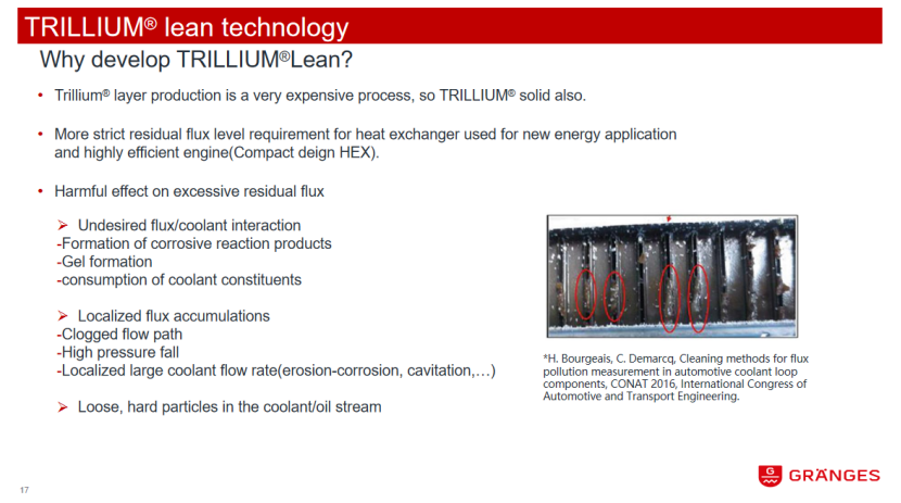 总结来说,虽然这项技术可能初始成本稍高,但考虑到减少的钎剂挥发和清炉时间,整体制造成本并不高。TRILLIUM Solid®技术适应于各种炉内环境,提供卓越的钎焊性能,特别适用于难以钎焊的换热器。而TRILLIUM Lean®则专注于实现更低的钎剂残余,与当前热管理系统的集成化趋势相契合,满足对钎剂残余的高要求。