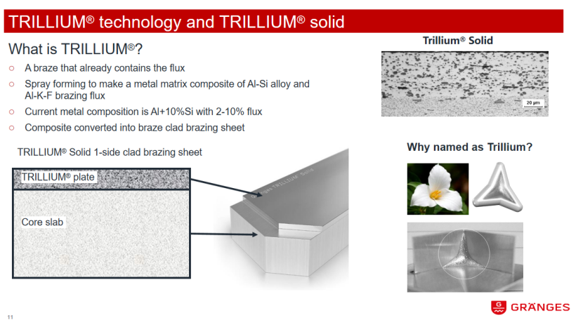 为解决这些问题,公司开发了新技术,通过粉末冶金将钎剂融入钎料中,经热机械过程转化为含钎剂和钎料的钎料层,无需额外涂附钎剂。此技术命名为Trillium,灵感来源于与钎焊接头相似的延龄草。