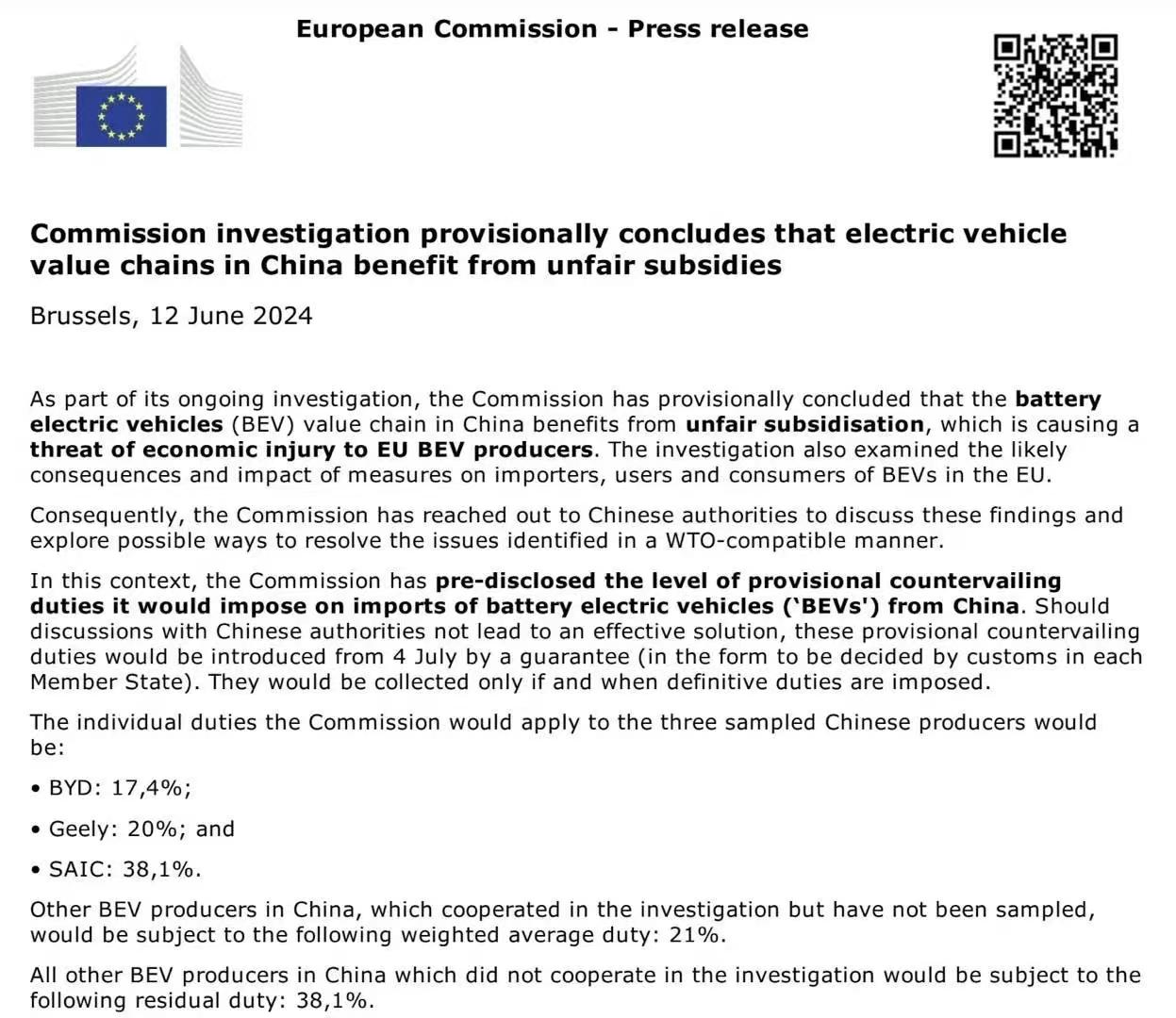 6月12日,欧盟披露了将对中国电动汽车加征的临时关税水平。其中,对已经配合抽样调查的比亚迪、吉利和上汽分别加征17.4%、20%和38.1%的关税;对配合欧盟调查但尚未被抽样调查的中国电动汽车生产商将征收21%的加权平均税;对其他未配合调查的中国电动汽车制造商将加征38.1%的关税。