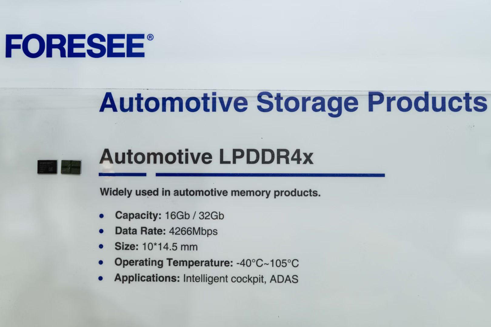 车规级 Grade2 LPDDR4x容量支持2GB、4GB、6GB和8GB,传输速率高达4266Mbps,支持-40℃~105℃极宽温的车规工作环境。为了提升数据一致性,产品配备了内部ECC,使其在满足数据传输效率的同时保证数据可靠性,提升车用产品品质。