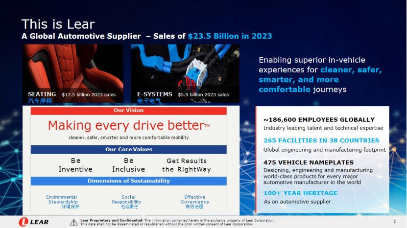 李尔公司是一家拥有百年历史的美国企业,专注于汽车座椅和电子电气领域,目前有265家生产基地分布在全球38个国家。李尔公司致力于为全球消费者提供清洁、安全、舒适及智能化的出行体验,并为众多主机厂提供优质的产品技术和服务。2023年,李尔实现销售总额235亿美元,同时在环保、社会责任及有效公司治理(ESG)方面积极履行承诺。