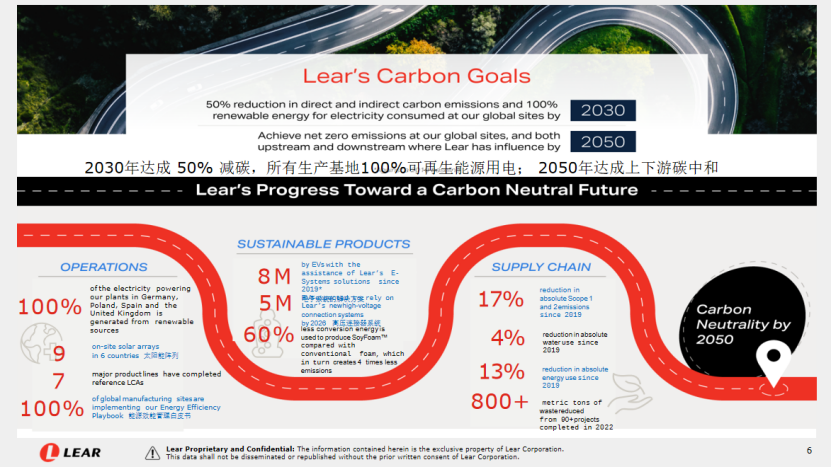 至今,李尔已在13个生产基地布设了太阳能光伏板,并在全球所有运营机构实施能源效能管理白皮书。李尔为绿色可持续发展在全球获得的专利及待批专利达到900多项。张立疆表示,李尔的减碳目标是,计划到2030年在全球运营机构减少50%碳排放,100%使用可再生能源;到2050年实现碳中和。