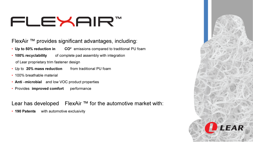 此外,李尔利用获得专利认证的FlexAir™ 3D挤塑聚合体材料制成的坐垫和靠背材料,既满足物理性能和舒适性,又具备出色的可持续性能,与传统发泡相比,可减少50%的二氧化碳排放,减重20%,同时实现整个产品100%可循环利用。