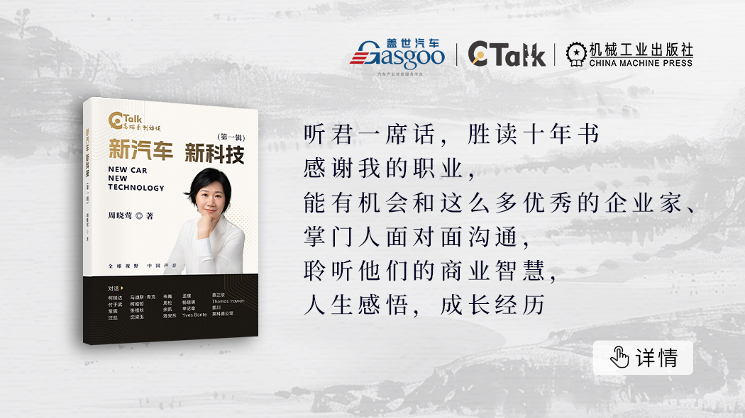 《新汽车 新科技》系列书籍精选C Talk高端访谈的精华内容,汇集为车能前沿CEO、资讯总编周晓莺与众多汽车产业企业高管的访谈实录,助力洞悉行业波澜壮阔的革新轨迹,为决策和行动提供支持。目前,该系列书籍已出第一辑,欢迎点击查看详情。